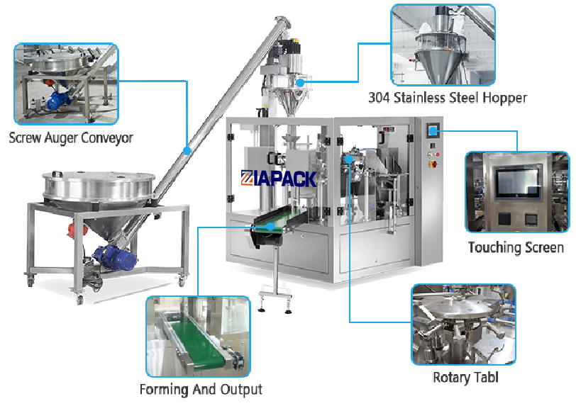 See masin võib automaatselt kotti võtta, kotti avada, materjali täita ja kotti pitseerida. Kasutatakse laialdaselt erinevate pulbrimaterjalide pakendamiseks.