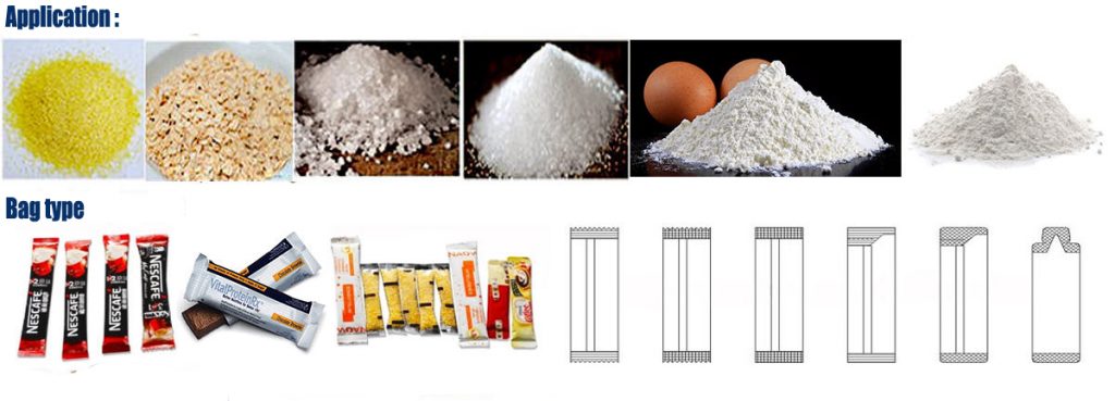 Seda masinat kasutatakse peamiselt pulbriliste toodete pakendamiseks: piimapulber, piimapulber, kohvipulber, vürtsid, karri pulber, valgupulber, maitseained, taimne pulber, kemikaalid ja meditsiinipulber tooted.